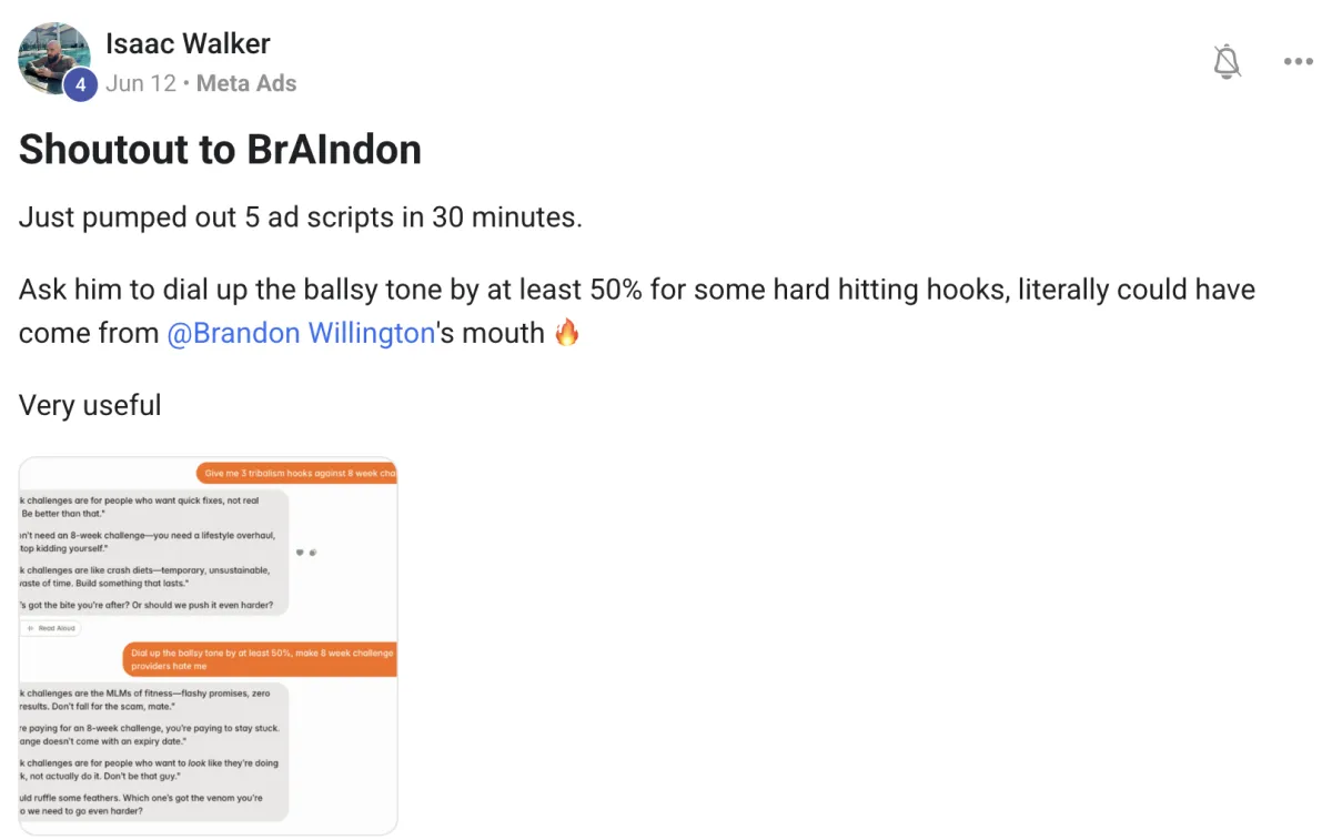 Unlimited use of BrAIndon (AI Brandon) for instant feedback on ads, landing pages and nurture sequenves.