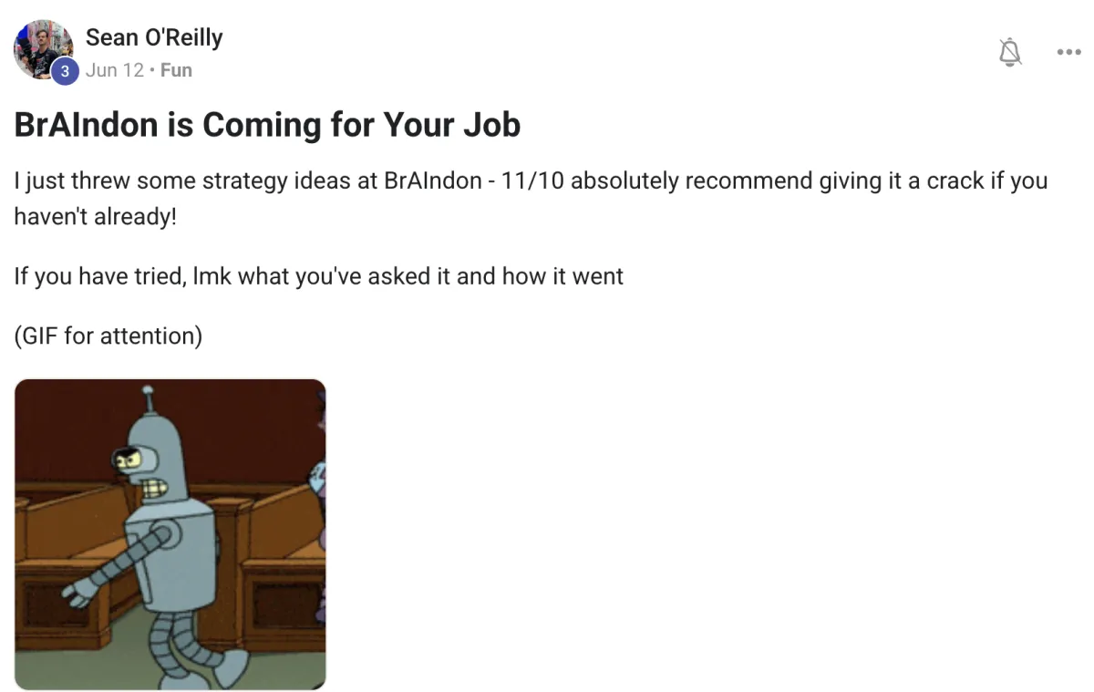 Trained off every workshop recording ever, every adisory call Brandon has done for members the past year, every piece of content Brandon has posted and every internal SOP Brandon has for marketing and sales.